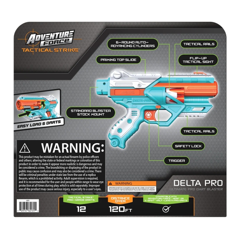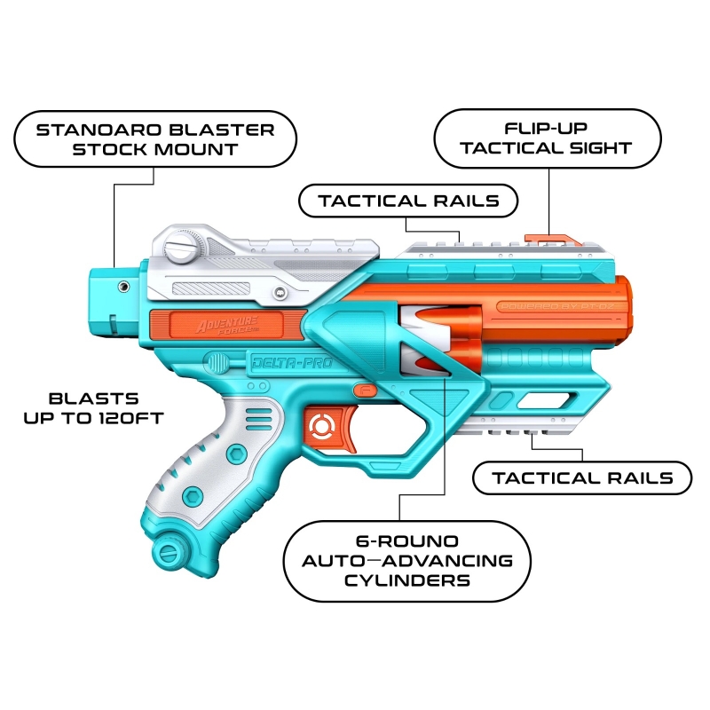 Adventure Force Delta Pro, a high-performance blaster built for teens and hobbyists who love tactical play. This advanced blaster features a 6-round auto cylinder for quick reloads, a priming top slide for smooth action, and a safety lock for responsible play.