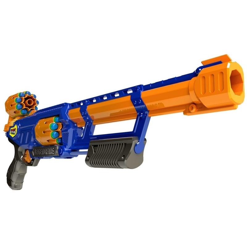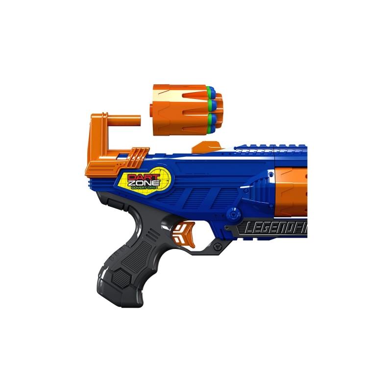 Dominate the backyard battlefield with the Legendfire pump-action powershot blaster. This long barrel blaster’s automatic revolving drums fire Super Darts up to 80-feet! The Legendfire Powershot Blaster features slamfire power! Take aim and challenge your opponents with this long barrel action blast. Pull back, push forward for incredible rapid-fire speeds! Its two auto-advance, revolving cylinders offer quick reloading so you never miss a shot. Use quick release button to replace ammo cartridge from tactical cartridge holster. Fires further, loads faster, and takes down targets in the blink of an eye. The Legendfire Blaster set includes one blaster, two ammo cartridges, and 18 Waffle tip Darts. Universal Waffle Tip Darts are compatible with Dart Zone blasters and most other major brands’ blaster toys.