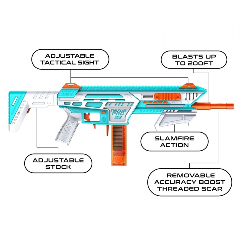 Equipped with slamfire action, the Nexus Pro X2 lets you keep the trigger held while rapidly priming for continuous play. Adjustable tactical sights, an adjustable stock, and a removable accuracy boost threaded SCAR allow players to fine-tune their setup for comfort and precision.