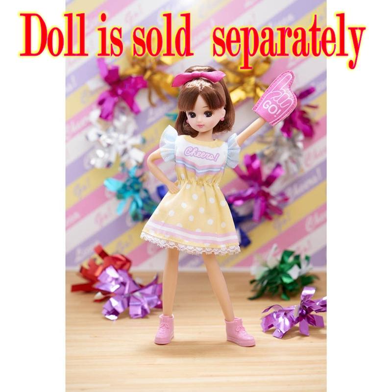 Cheerleader style dress with refreshing yellow color. Your Licca-chan doll can be the cutest cheerleader you've ever seen with this dress set! It includes a fun cheerleader costume in sunny yellow, a pink "Go!" hand to wear to encourage her favorite team, and a lavender backpack to take all her stuff home with after the game. Shoes and a hair accessory are also included, although the doll shown is not included.